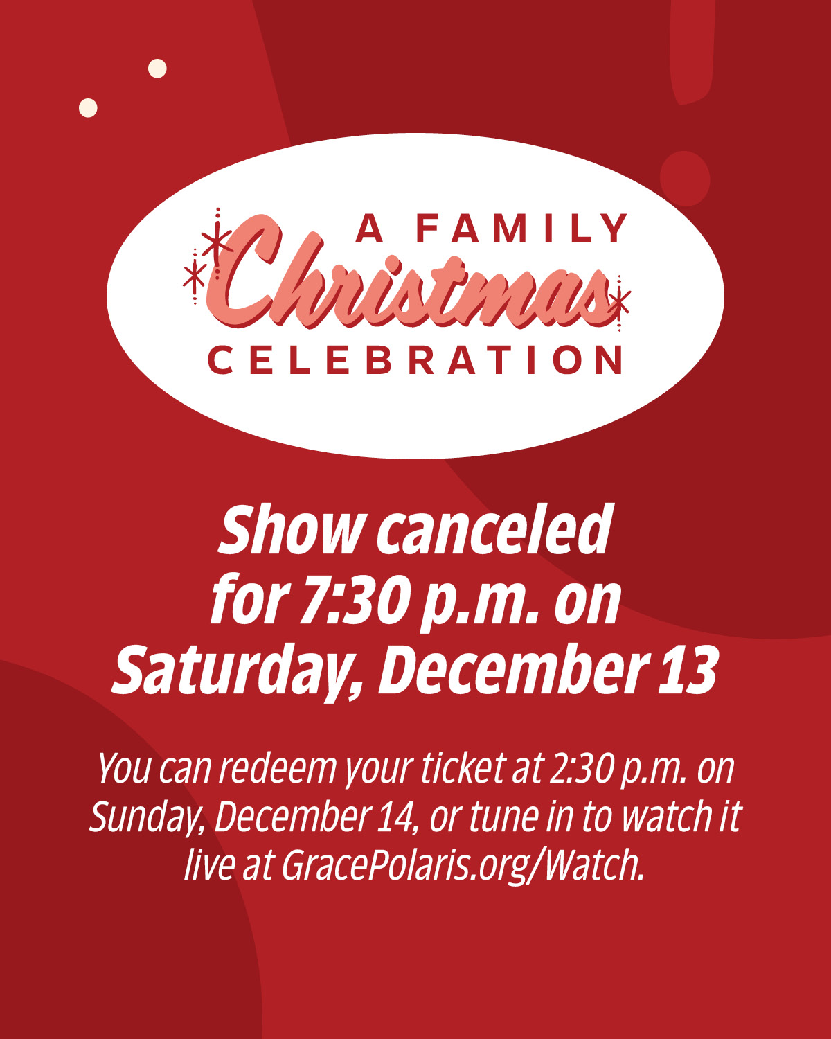 Due to weather, the 7:30 p.m. show on Saturday, December 13 has been canceled. If you have a ticket for this show, you can use it at the 2:30 p.m. show on Sunday, December 14 on a first-come, first-seated basis. You can also watch a livestream of that performance at GracePolaris.org/Watch. Thank you for understanding and stay safe!